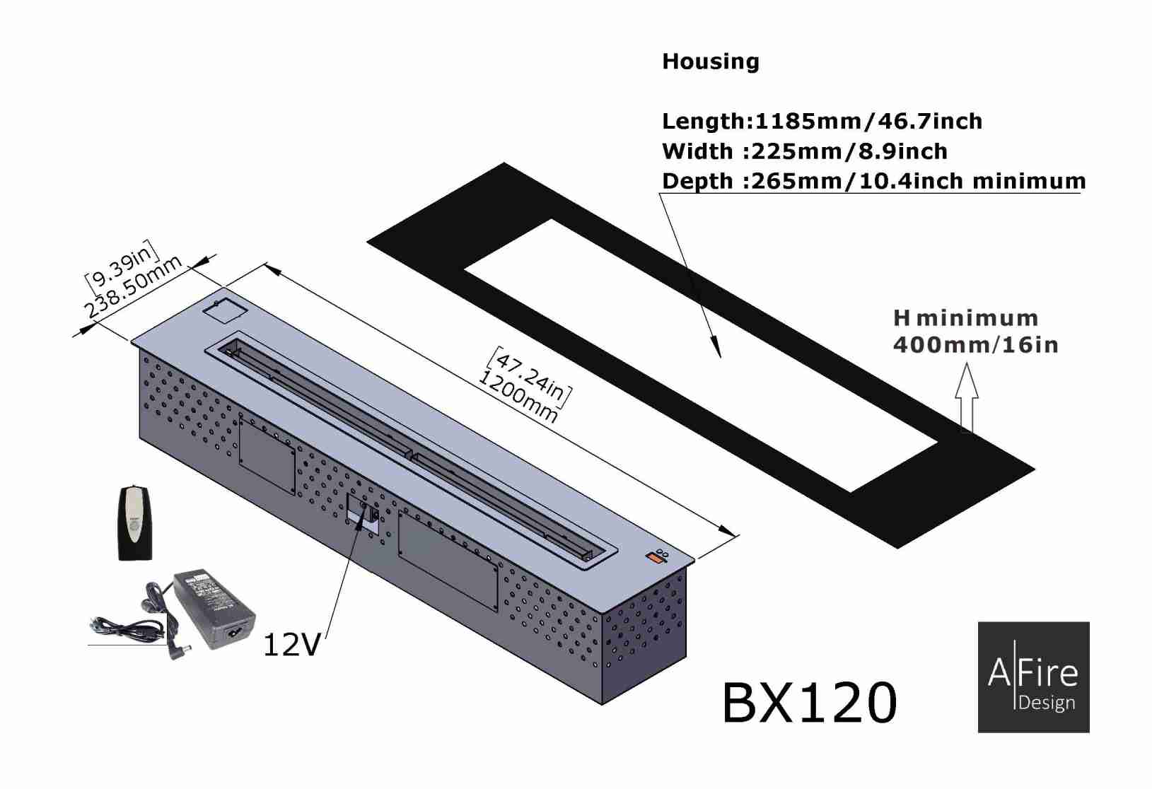 Consulte todas las especificaciones técnicas del quemador de etanol automático XL BX120 AFIRE, empotrable y equipado con mando a distancia. Esta ficha técnica contiene toda la información esencial para integrar el modelo BX120 en proyectos residenciales o comerciales de diseño.