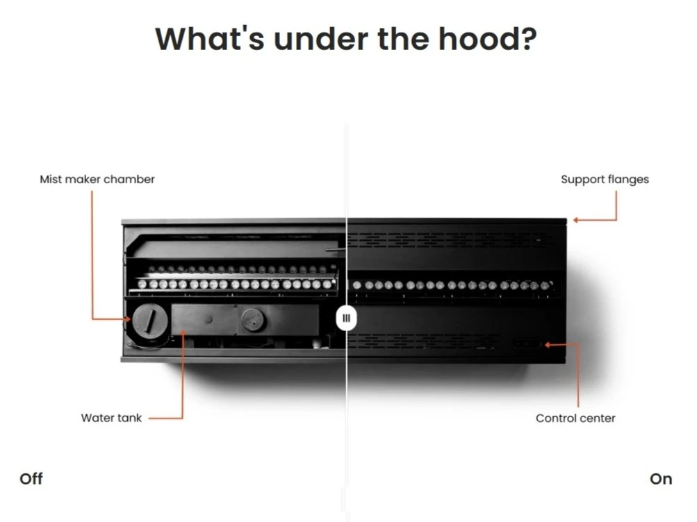 La conception d’une cheminée à vapeur d’eau prend également en compte l’intégration, l’entretien et la durabilité. Les prises d’air sur la plaque supérieure et les côtés permettent un encastrement discret sans grilles visibles. L’accès aux modules et au remplacement des mist makers se fait par le dessus, ce qui facilite la maintenance, notamment dans les projets exigeants ou les lieux recevant du public. Cette approche améliore l’expérience utilisateur et la longévité de l’appareil.