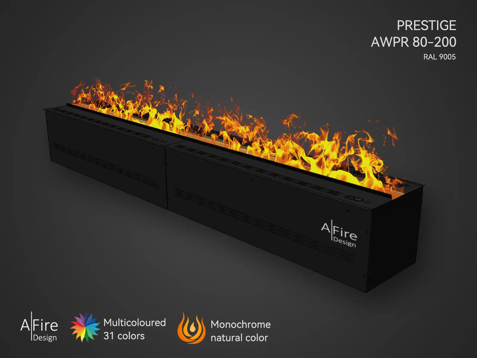 La cheminée électrique à vapeur d’eau PRESTIGE 200 cm à flammes naturelles et multicolores AWPR 80-200 Aquafire par AFIRE® offre des flammes froides ultra-réalistes, des teintes ajustables et un contrôle intelligent intuitif. Son format XL en fait un modèle d’exception pour les grands espaces.