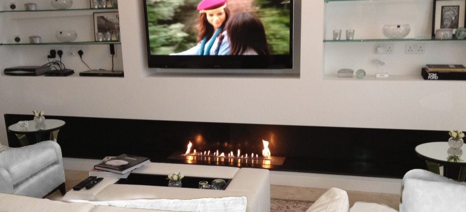 Fireplace and television: a new design idea for your house. The installation of a bio ethanol fireplace near a television in the living room of an apartment or house is becoming increasingly common with the advent of ventless ethanol fireplaces. The advantage of the solution lies in the creativity of the design, which can be customized without limits and adapt to your “life style” and the atmosphere of your interior decoration.
