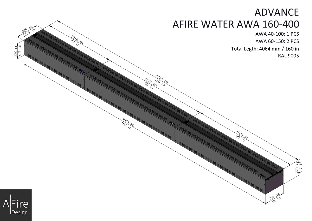 Caminetto elettrico ad acqua ADVANCE 400 cm con fiamme naturali AWA 160-400 Aquafire by AFIRE® – Questo caminetto XXL è dotato della tecnologia avanzata di fiamma a vapore acqueo a doppio flusso d’aria AFIRE™. Progettato per grandi spazi, unisce un’estetica moderna ed elegante a una tecnologia all’avanguardia, rendendolo la scelta ideale per creare una linea di fuoco spettacolare nelle residenze private o negli spazi pubblici.