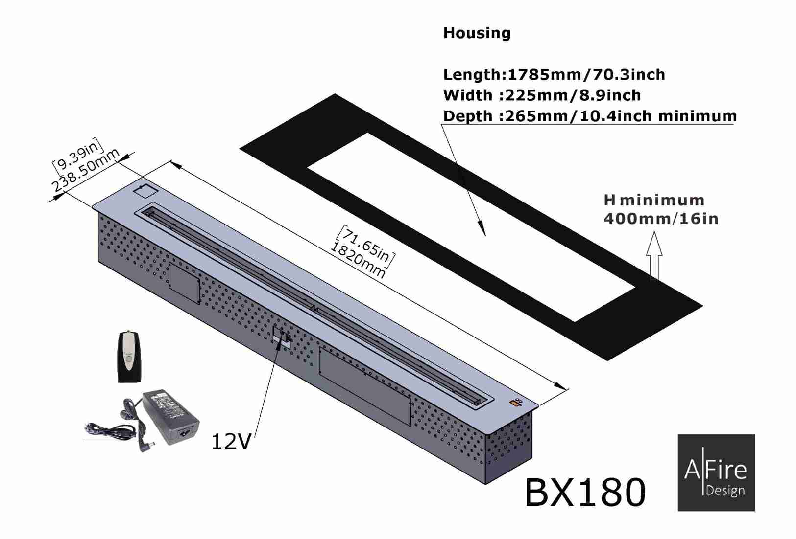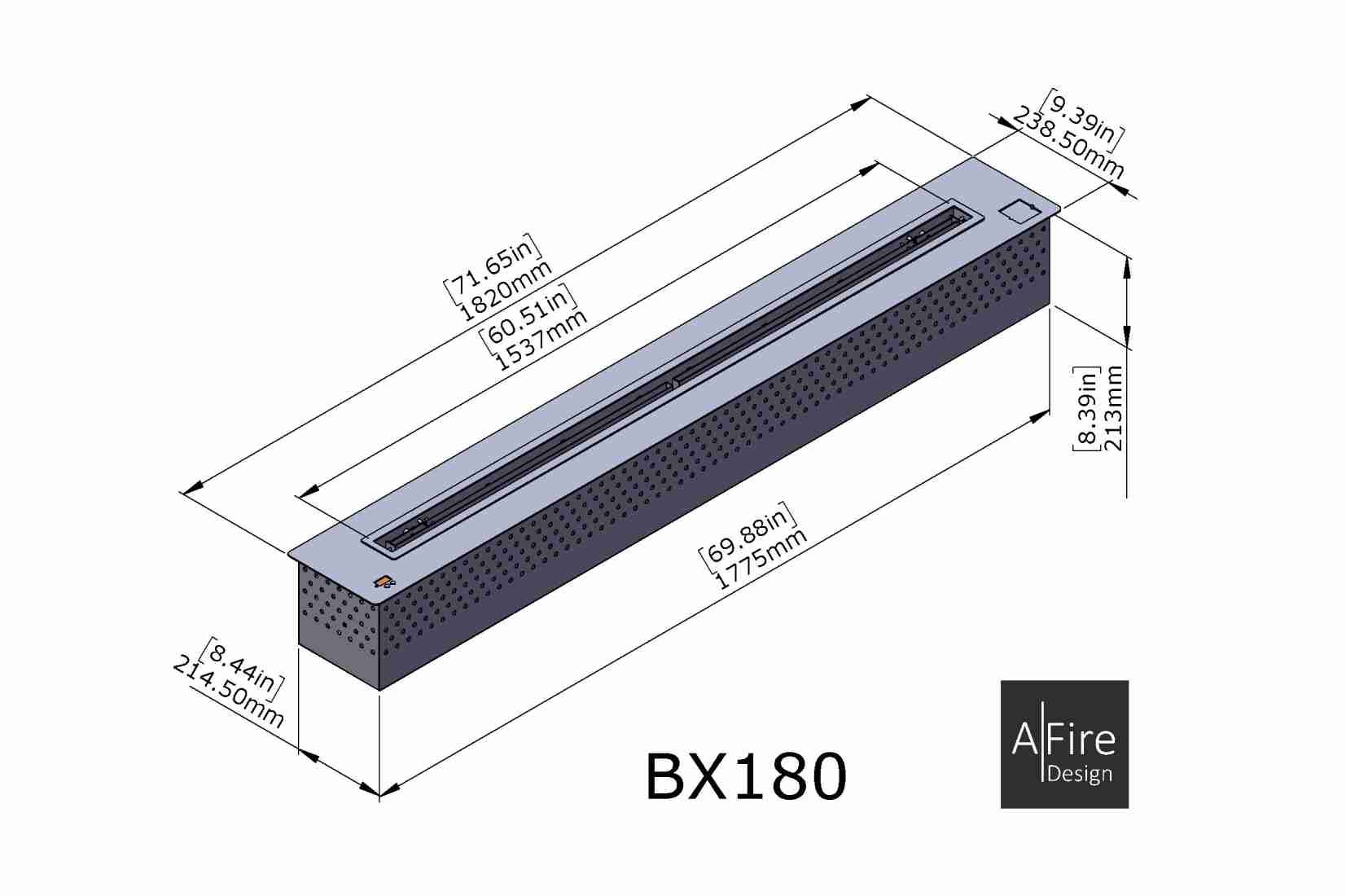 Discover the specifications and detailed features of the BX180 automatic and remote-controlled built-in XXL ethanol burner by AFIRE. This technical sheet provides all essential information for integrating the BX180 model into your interior design projects.