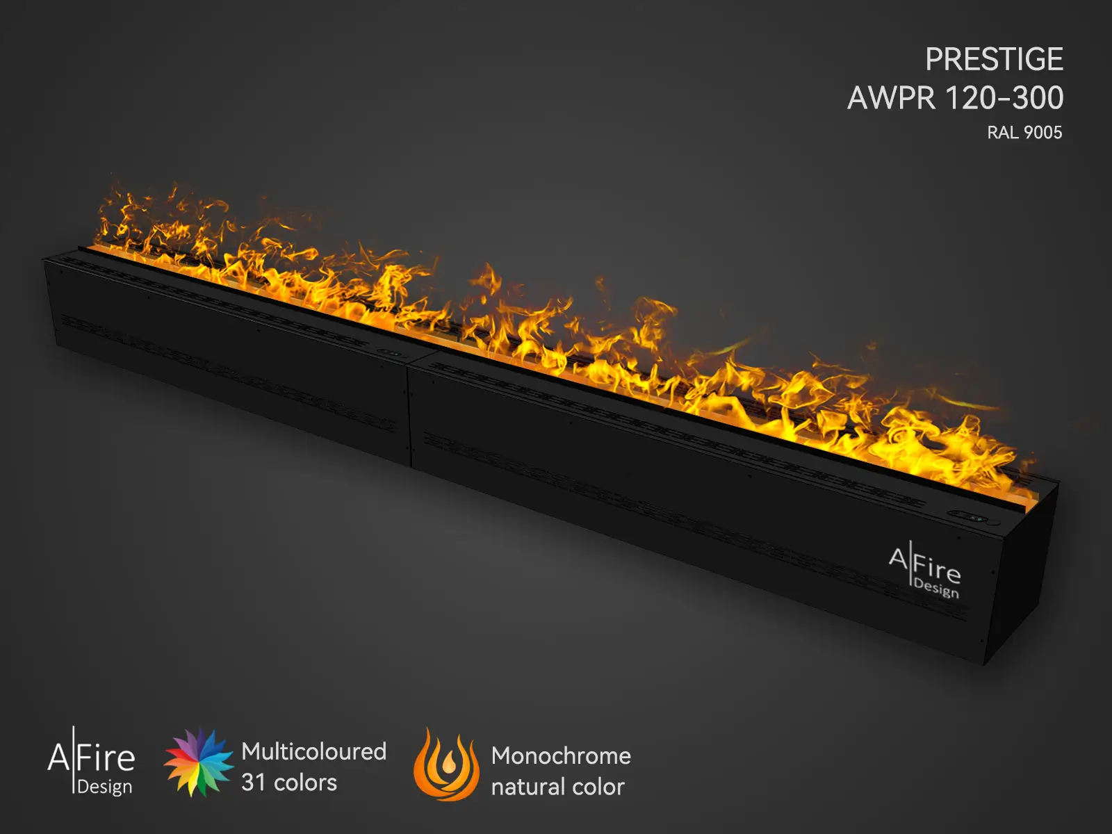 | Flame Colors | Two rows of Amber (orange) and RGB LED bars offering natural flame effects, multicolor, or both mixed – Exclusive to AFIRE. |