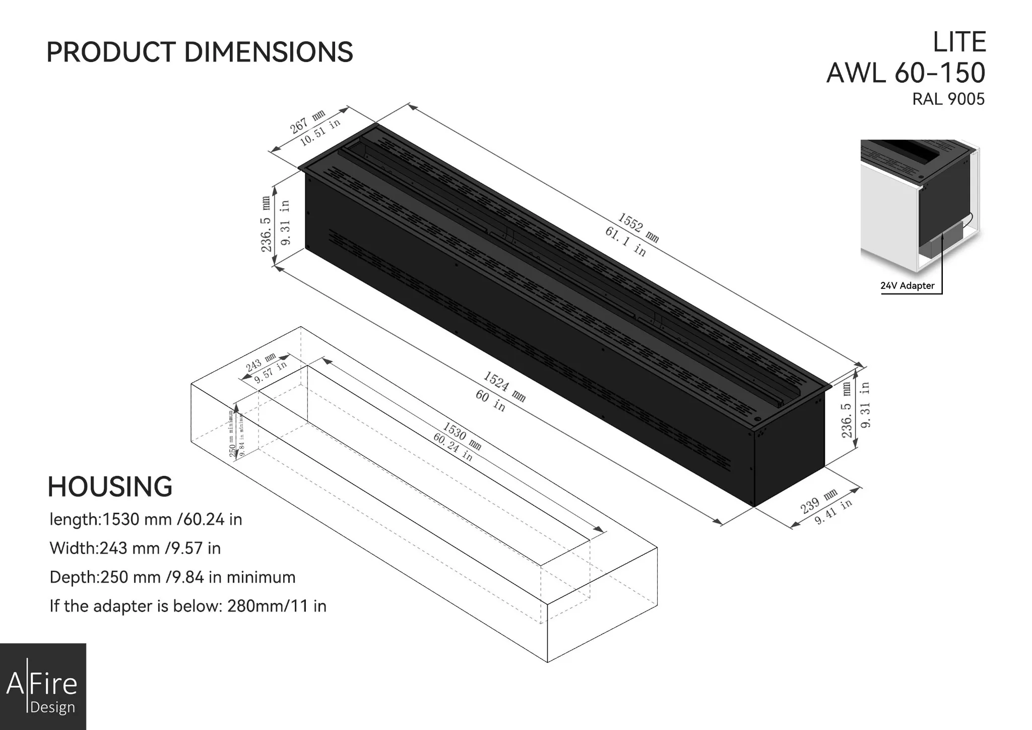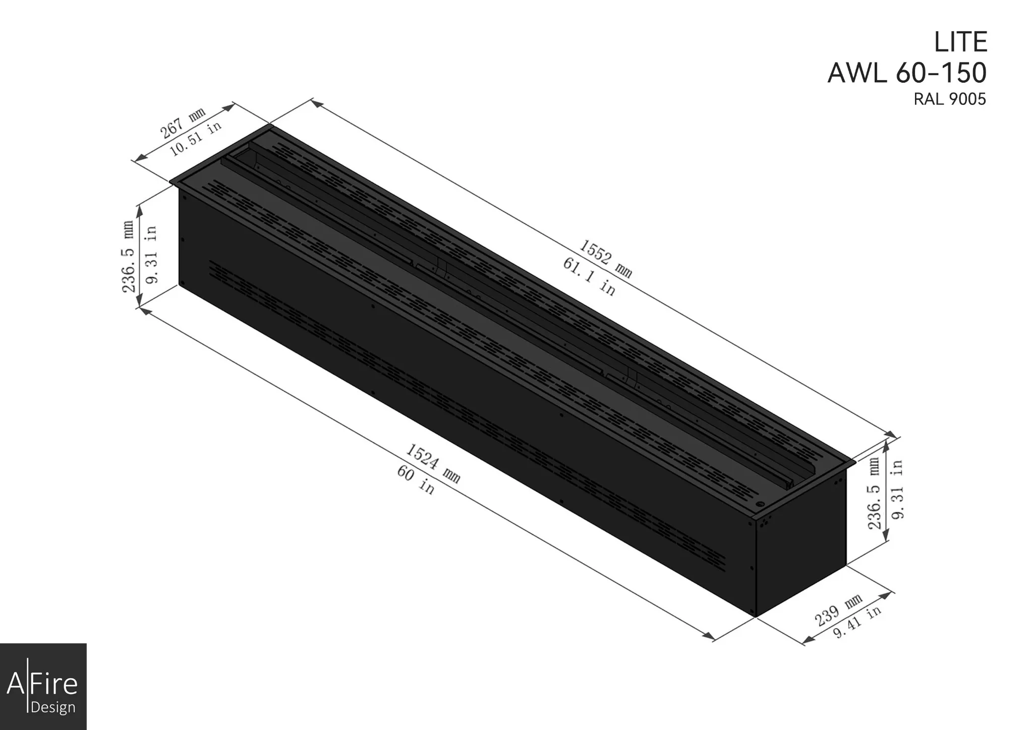 Water vapor electric fireplace LITE 60 in / 150 cm – natural flames AWL 60-150 Aquafire by AFIRE® – Designed for residential use, this 60 in / 150 cm model delivers a highly realistic visual experience with its cold, natural-looking flames. As the largest unit in the LITE range, it is perfect for creating a warm and vibrant decorative feature in living rooms and open spaces. With no smoke or particle emissions, this water vapor fireplace is an ecological and safe solution to enhance your interior. The LITE collection is dedicated to residential use and offers an accessible alternative, without compromising on quality and safety, backed by the technological expertise of Aquafire by AFIRE.