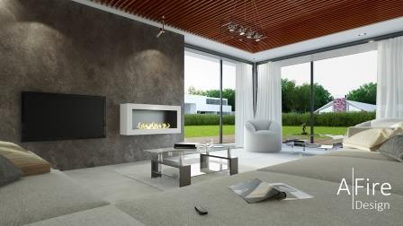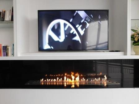 Most of the time, having the fire line under the television is the preferred design. However, some designers prefer installing the fireplace next to the flat screen. The television fireplace set is designed with the simple idea that the heat emanating from the fire area should not damage the electronic devices. If the television and fireplace are placed side by side, there is no issue, since heat rises (if you leave a few dozen centimeters between them – 10 or 20 inches). However, if the flat screen TV is installed above the ethanol burner, it becomes necessary to either divert the heat with a leveling difference (in front or in the back) or to create a recess for the TV.